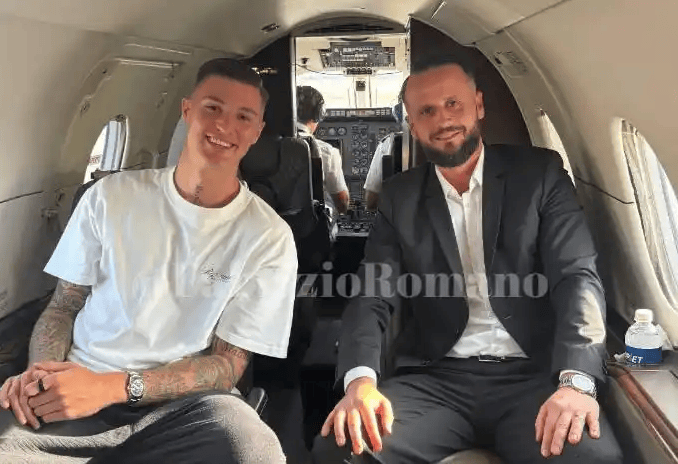 塞斯科和他的经纪人埃利维斯-巴萨诺维奇正在前往曼彻斯特的飞机上,这是塞斯科在曼联和莱比锡谈妥之后的首张照片,曼联是他梦寐以求的俱乐部。